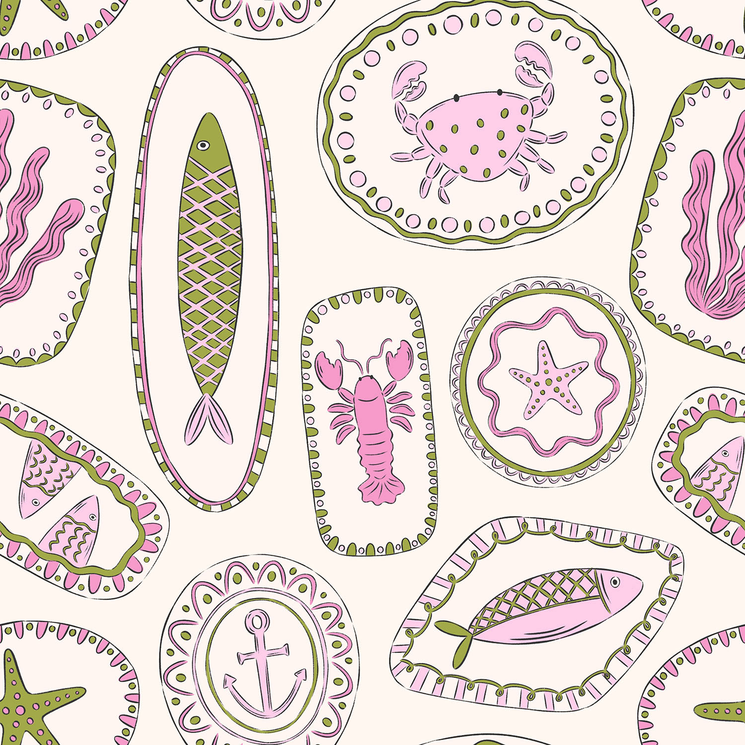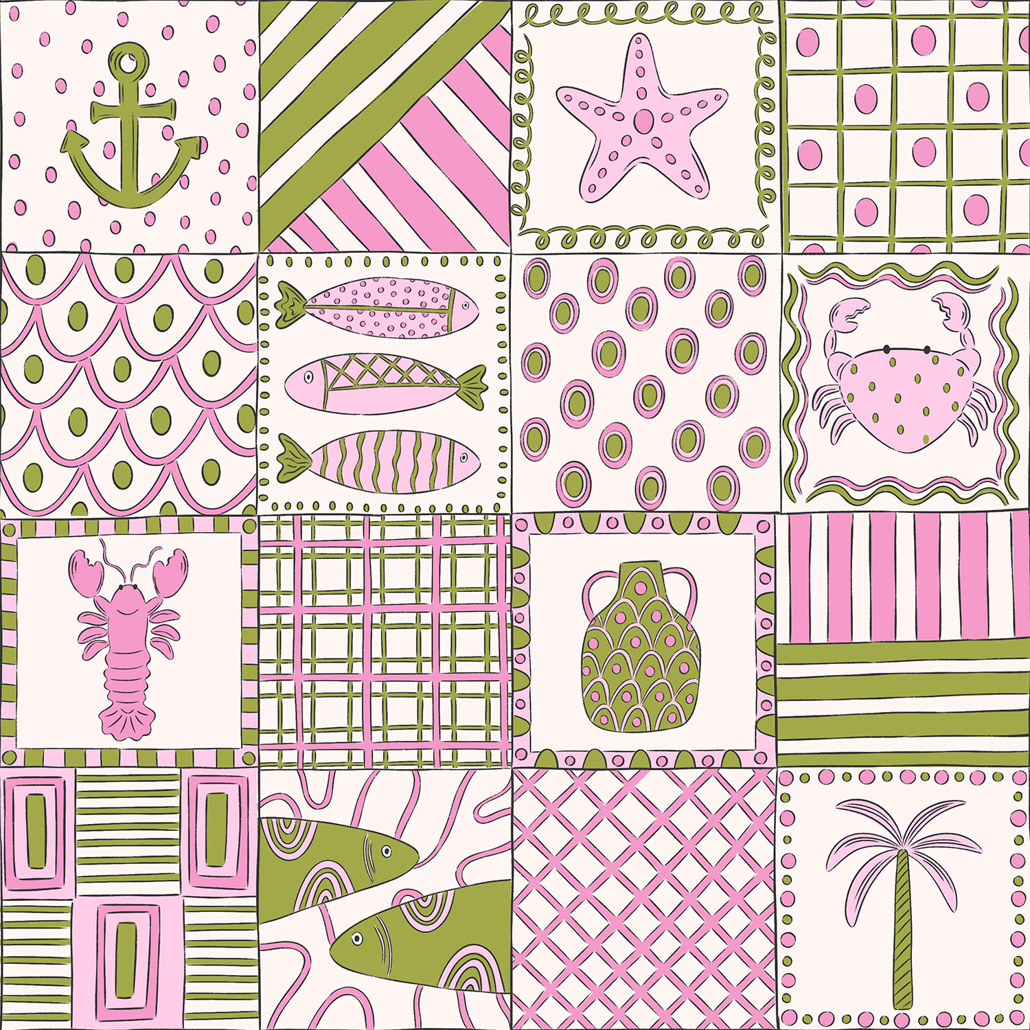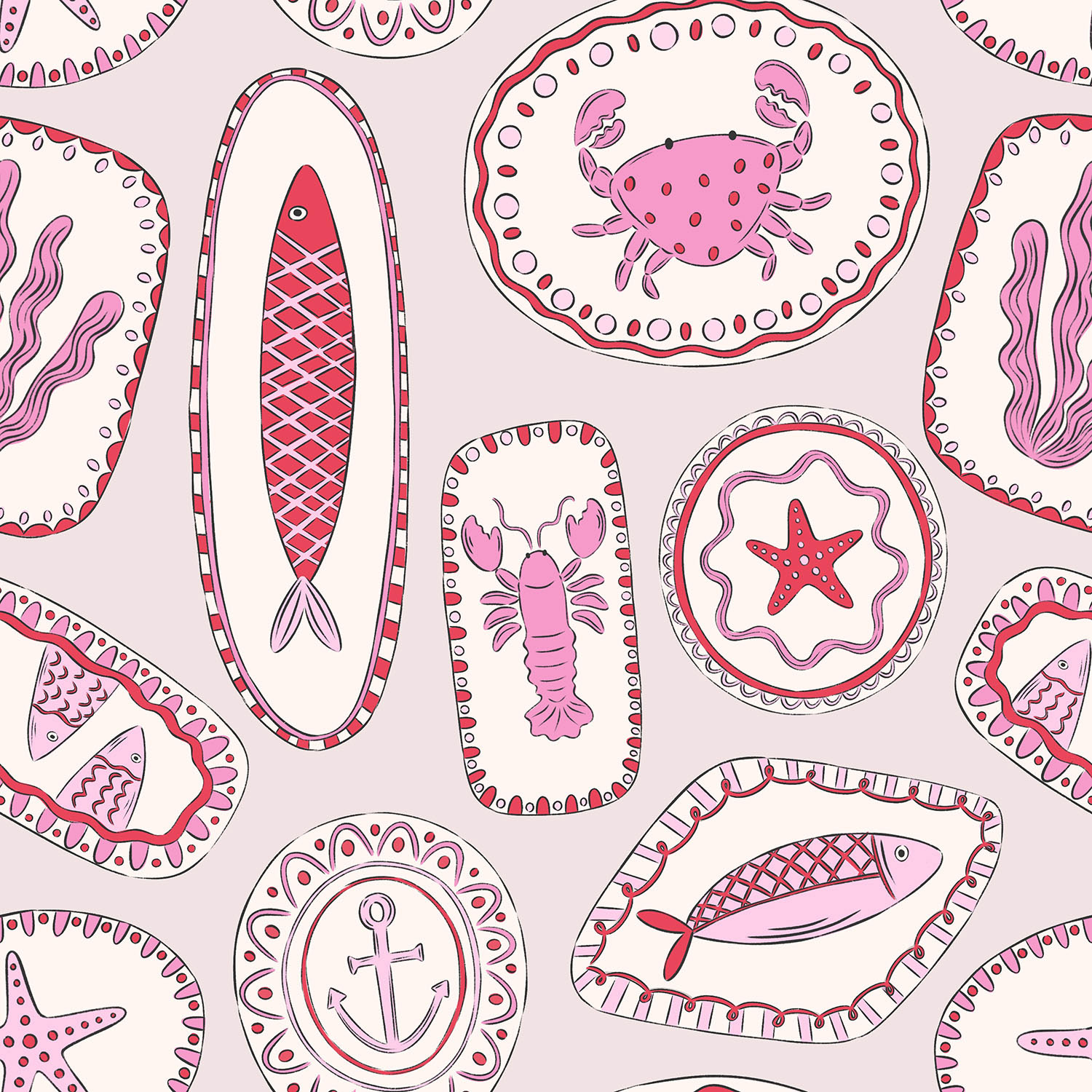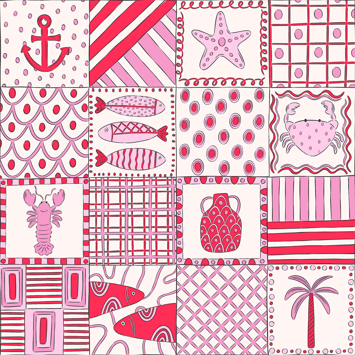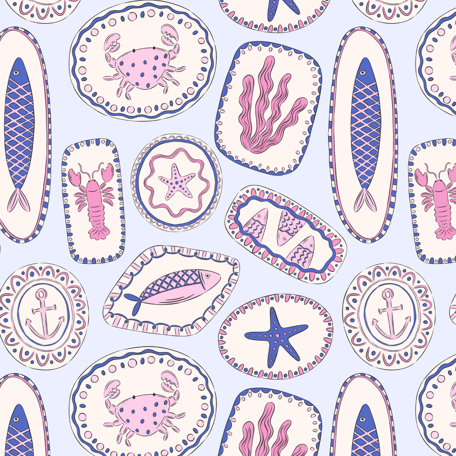 A coastal inspired pattern collection combining hand-drawn ceramics, nautical motifs and playful colour palettes. Designed for stationary, homewares and gift products, shown in three colour ways.