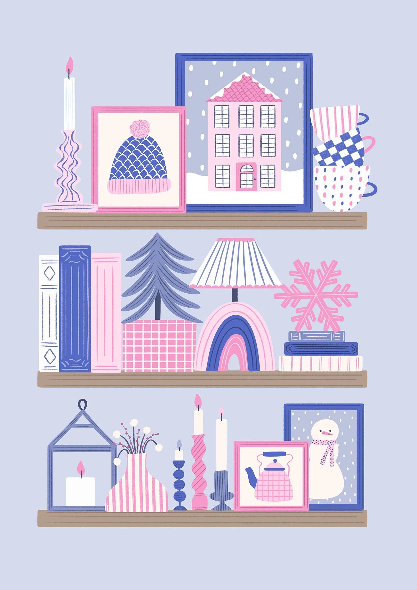 A colourful illustration series celebrating the changing seasons through styled shelves filled with decorative objects, plants and cosy details. Designed to bring warmth and personality to stationery, wall art and home products.