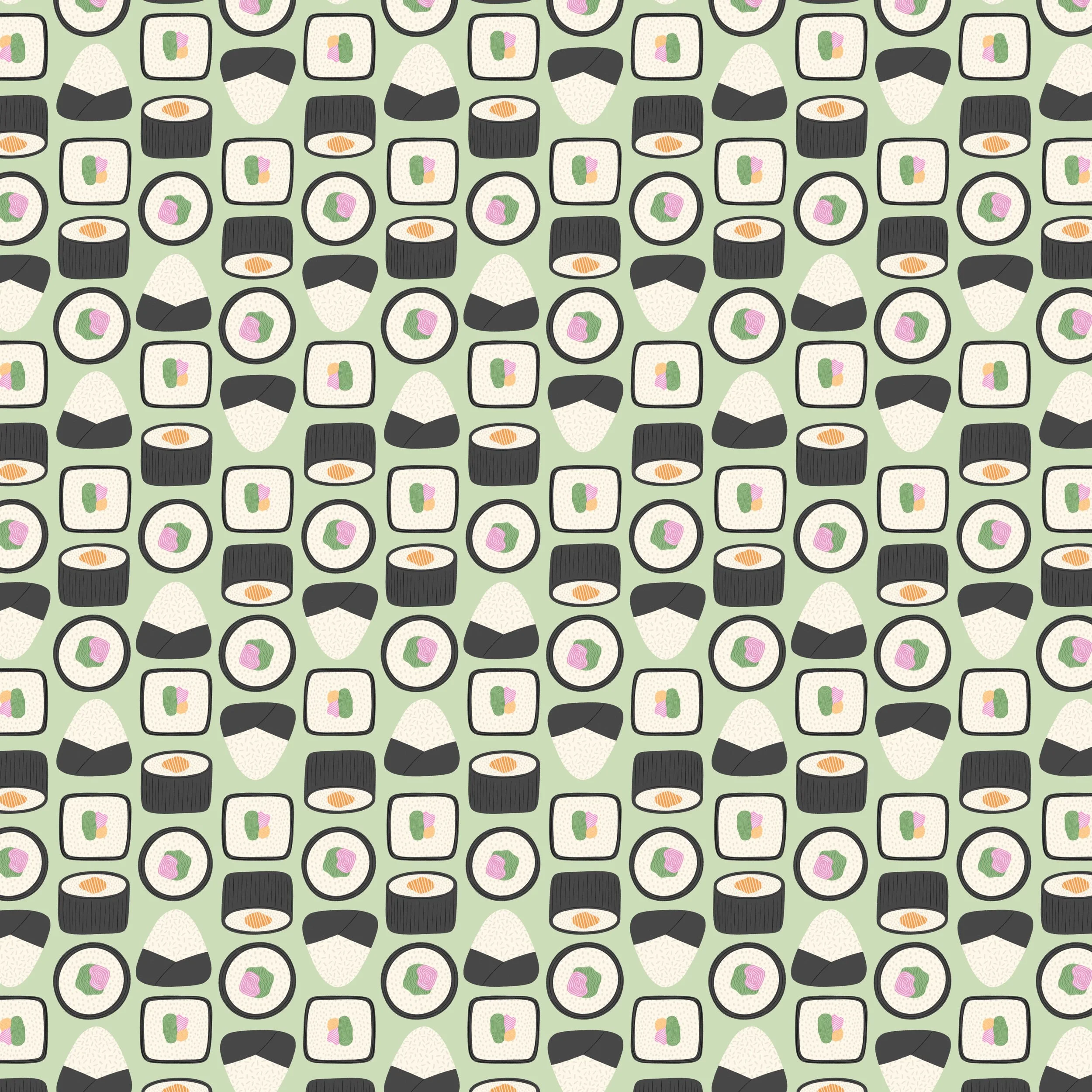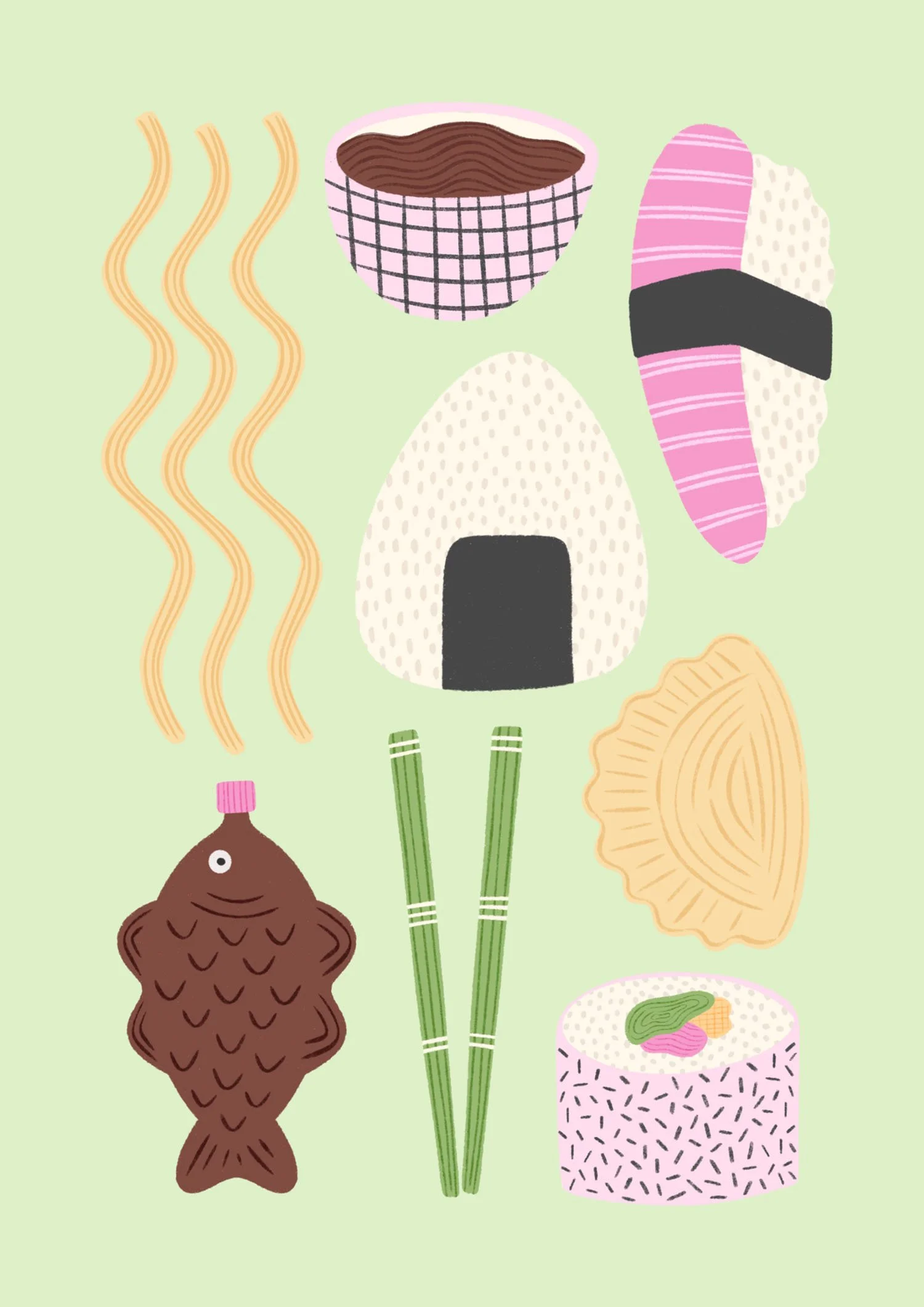 A fun mini collection inspired by Japanese comfort food, featuring ramen, sushi and rice motifs in a bright, contemporary palette. Perfect for food-themed stationery, kitchen accessories and playful giftware.